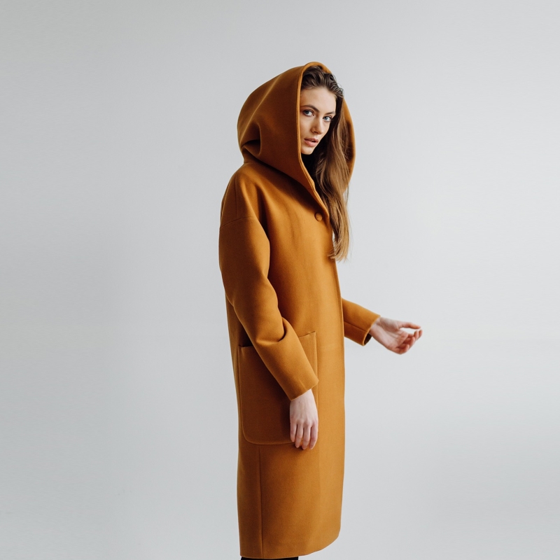معطف خندق صلب بخط طويل بلون أصفر خردل ، له طية صدر مسننة ، مزدوجة الصدر مع زر للإغلاق ، أكمام طويلة ، جيبان ، بطانة مرفقة
