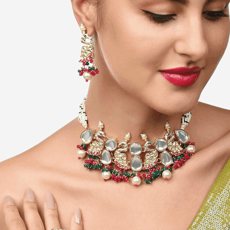 • Feature: You can never go wrong with a choker necklace! Indian style choker necklaces have been a staple at bridal parties and traditional events since forever & why not? Beautifully crafted and bedazzled with gems they’re perfect with ethnic outfits! A choker necklace is the type of fashion accessory that has the potential to upgrade the simplest of traditional outfits! Wear it to traditional events or weddings. We thought why not save this gorgeousness for you!