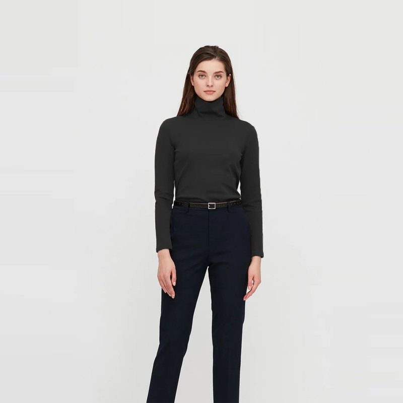 تي شيرت أسود صلب ، له ياقة سلحفاة ، وأكمام طويلة.