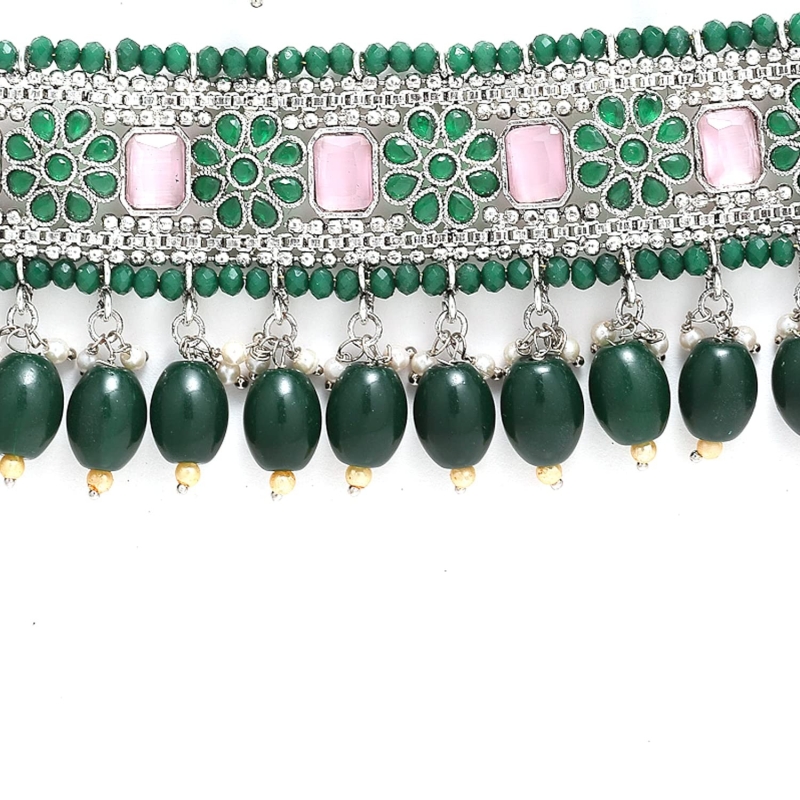 Silver Plated Green & Pink Stone-Studded Traditional Choker Necklace With Earrings Jewellery