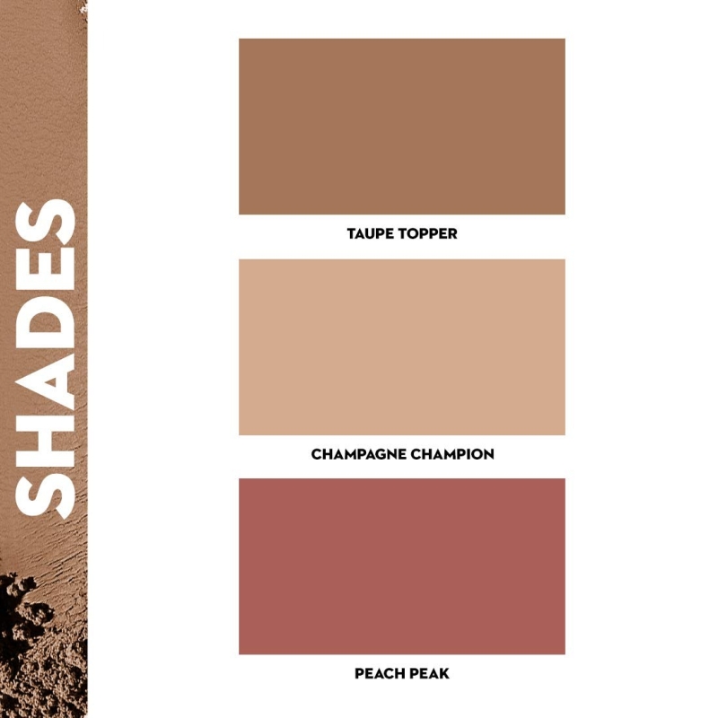 • (L to R): Taupe Topper (Cool-toned Brown Bronzer), Champagne Champion (Champagne Gold Highlighter), and Peach Peak (Soft Peach Pink Blush)