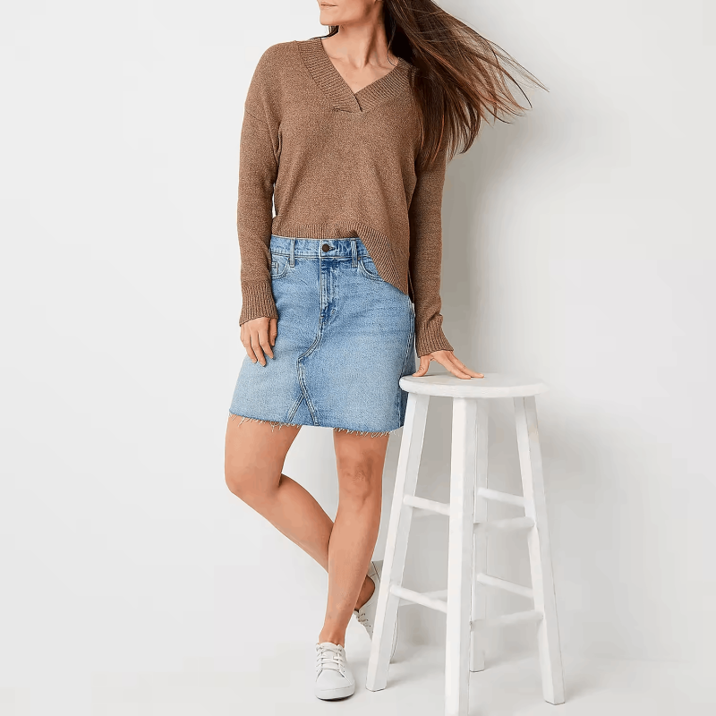 • women's high-rise denim mini skirt with a bit of stretch so you can move throughout your day in comfort and features a classic button-zip fly, belt loops, 5-pocket tailoring, and distressed details for an on-trend appeal.